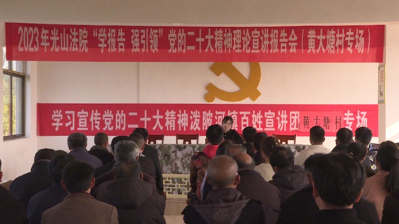3月2日下午,县人民法院在泼陂河镇黄大塘村举办党的二十大精神理论宣讲报告会。县法院道德模范、“河南好人”、“信阳好人”、“光山好人”宣讲团成员汪婷婷,县百姓宣讲团成员苏汝以“学报告、强引领”为主题,结合农村工作实际,深入浅出地解读了党的二十大精神新内涵,受到农村党员的热烈欢迎。